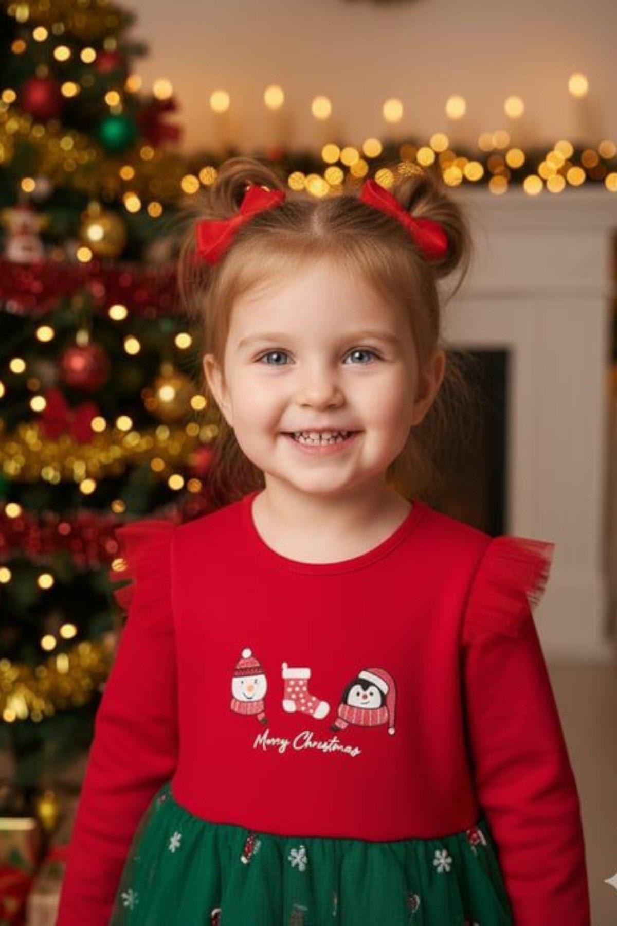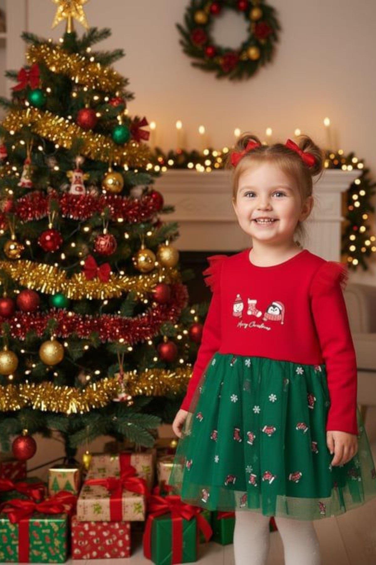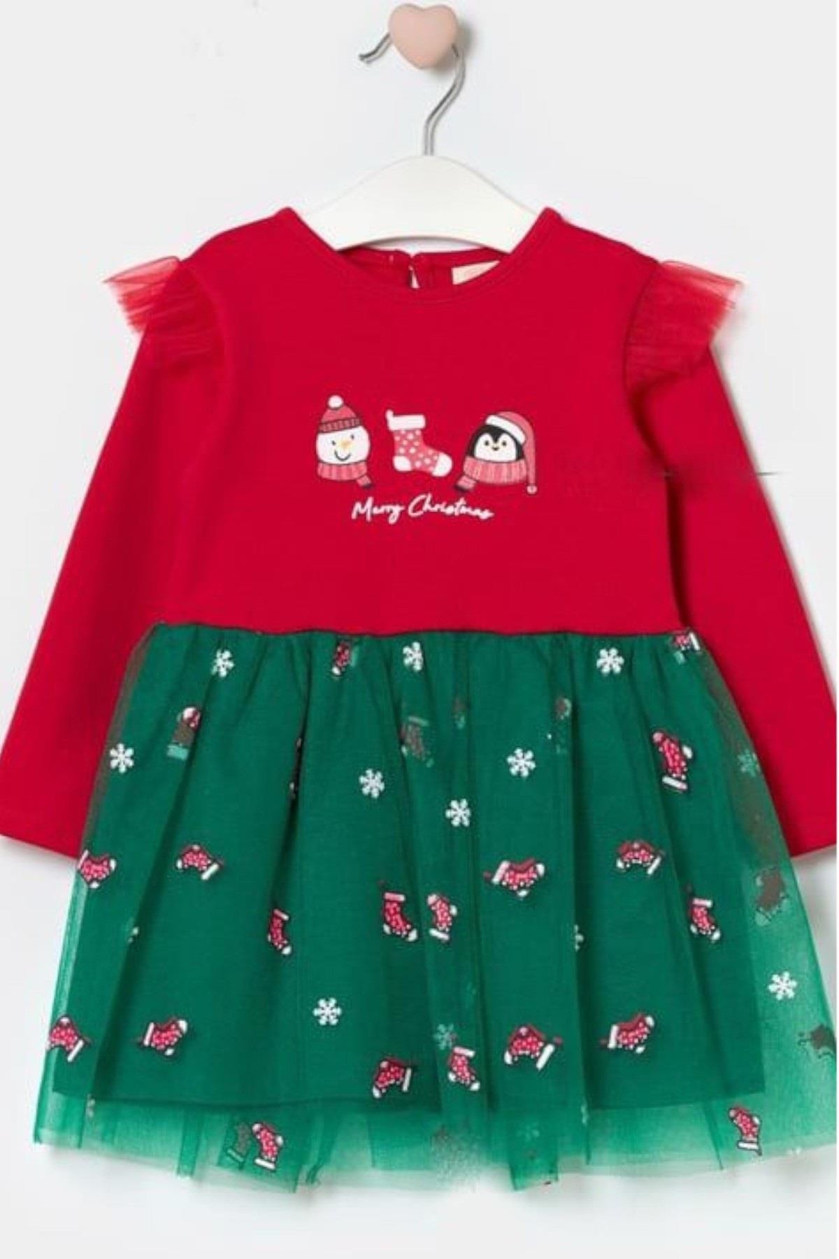 Mojo Kız Bebek 9-24 Ay Penguen Desenli Tüllü Yılbaşı Elbise Kırmızı (26KKCMJO24915)